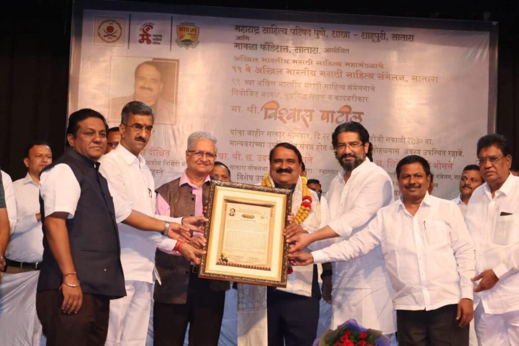 सातारा : राजधानी सातारा येथील छत्रपती शाहू कला मंदिरात अखिल भारतीय मराठी साहित्य संमेलनाचे अध्यक्ष डॉ. विश्वास पाटील यांचा जाहीर सत्कार करण्यात आला. राज्याचे बांधकाम मंत्री व संमेलनाचे स्वागताध्यक्ष छत्रपती शिवेंद्रसिंहराजे भोसले यांच्या हस्ते पाटील यांचा शाल, श्रीफळ आणि पुष्पगुच्छ देऊन गौरव करण्यात आला.