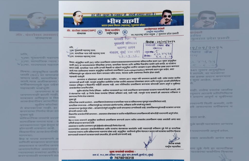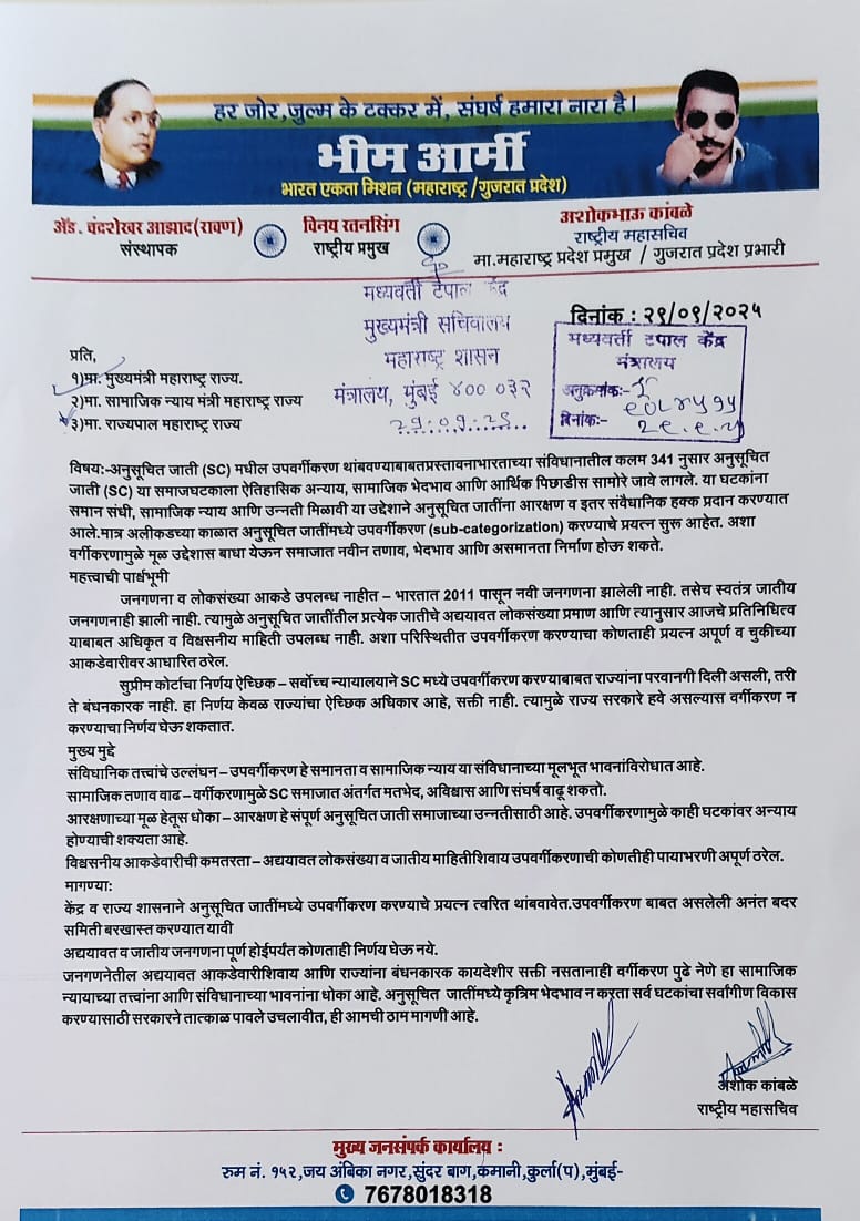 अनुसूचित जातींमध्ये उपवर्गीकरण करण्याचे प्रयत्न थांबवावेत, अशी ठाम मागणी भीम आर्मीने मुख्यमंत्री, सामाजिक न्याय मंत्री आणि राज्यपालांकडे केली आहे.