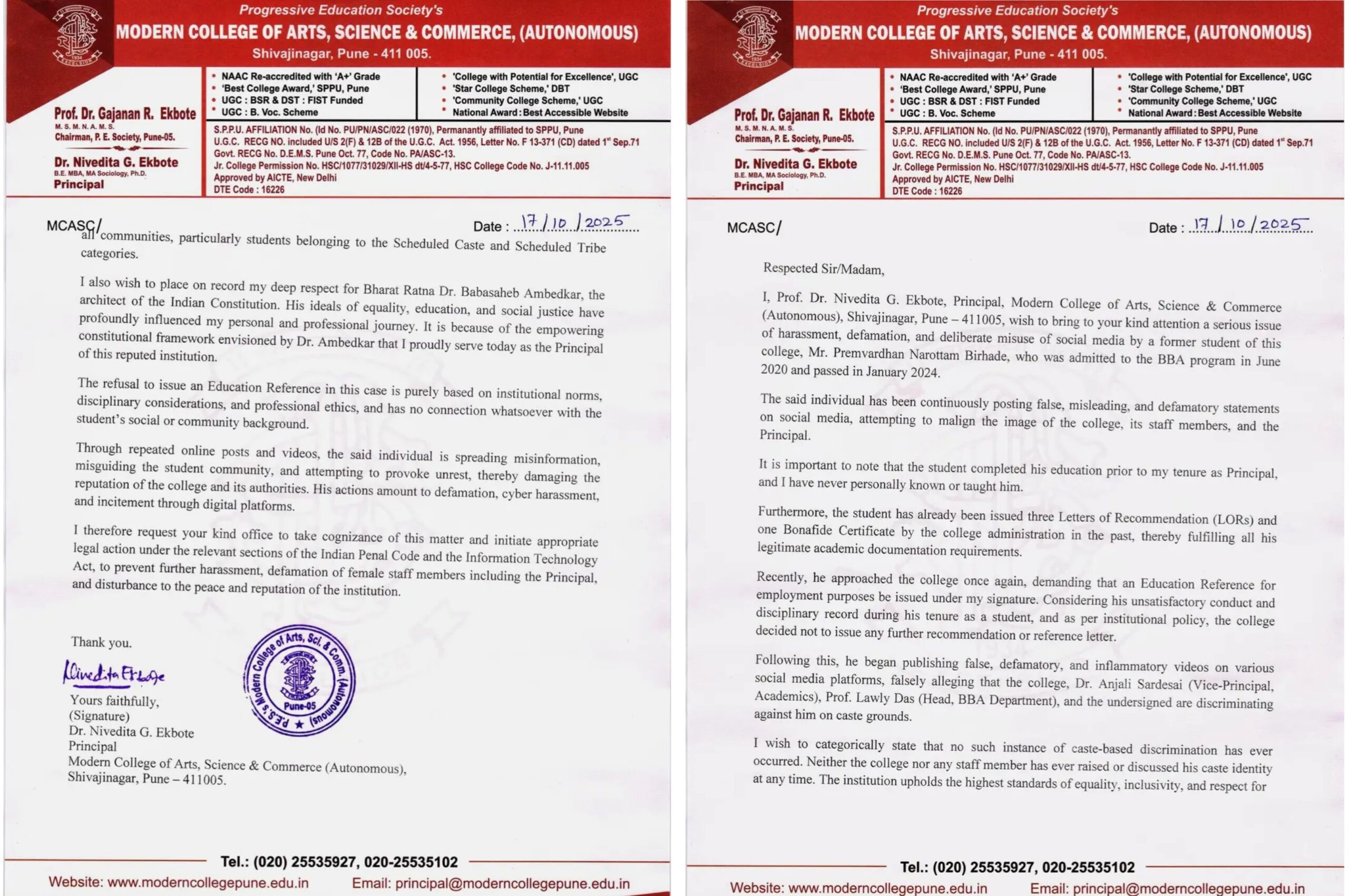 मात्र प्राचार्या निवेदिता एकबोटे यांनी पत्रात म्हटलं आहे की, “सदर विद्यार्थी महाविद्यालयातून २०२४ मध्ये पदवीधर झाला असून त्याला यापूर्वी तीन वेळा Letter of Recommendation (LOR) आणि एक बोनाफाइड प्रमाणपत्र देण्यात आलेले आहेत. त्याच्या मागण्या संस्थेच्या धोरण आणि शिस्तीच्या निकषांवरून नाकारल्या गेल्या आहेत. त्याच्या जातीय पार्श्वभूमीशी याचा काहीही संबंध नाही.