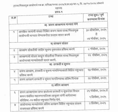 हरकती व सूचना: प्रारुप आरक्षण १७ नोव्हेंबर २०२५ रोजी प्रसिध्द करण्यात येईल, तर हरकती व सूचना मागविण्याची अंतिम तारीख २४ नोव्हेंबर २०२५ आहे.