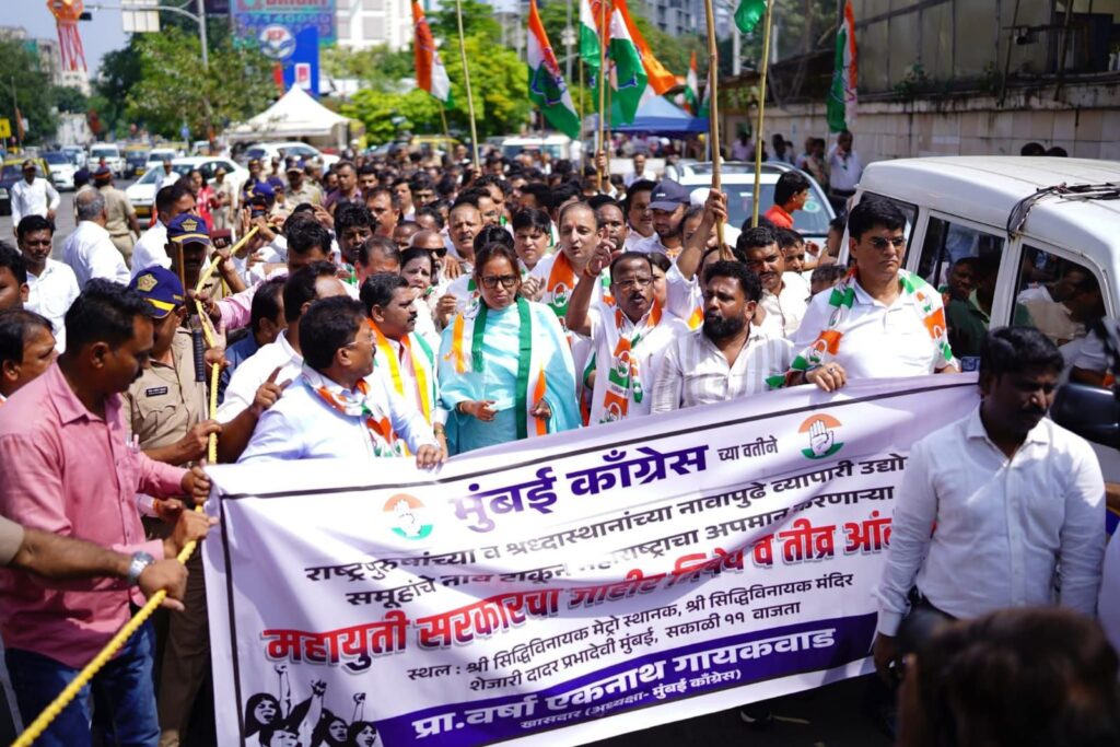 मुंबई काँग्रेसतर्फे आज सिद्धिविनायक मंदिराजवळ भव्य आंदोलन करून महाराष्ट्राच्या अस्मितेचा आवाज बुलंद करण्यात आला. या आंदोलनाचं नेतृत्व खासदार वर्षा गायकवाड यांनी केलं. ‘ही भाजपची महाराष्ट्रद्वेषी सरकार आहे, जी केवळ सत्ता आणि पैसा यासाठी जन्माला आली आहे,’ असा आरोप त्यांनी यावेळी केला.