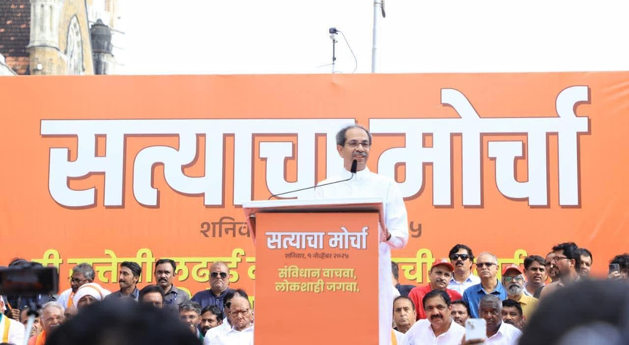 राज्यातील मतदार याद्यांतील गोंधळ, बोगस नावे आणि संशयास्पद नोंदींच्या विरोधात महाविकास आघाडी व मनसेचा ‘सत्याचा मोर्चा’ आज पार पडला. राज ठाकरे यांच्यानंतर व्यासपीठावर आलेल्या शिवसेना (उद्धव) पक्षप्रमुख उद्धव ठाकरे यांनी निवडणूक आयोगासह भाजप नेत्यांवर थेट लक्ष्य साधत वातावरण तापवले.