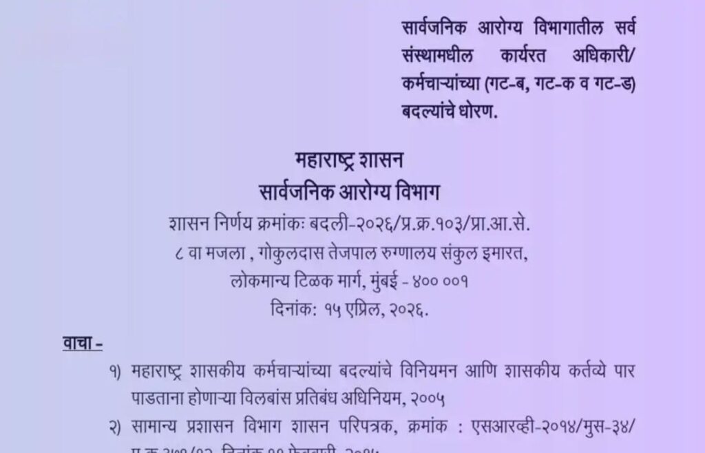 राज्य सरकारी कर्मचाऱ्यांच्या बदल्यांबाबत महत्त्वाचा निर्णय घेत महाराष्ट्र शासनच्या सार्वजनिक आरोग्य विभागाने १५ एप्रिल रोजी नवा शासन निर्णय (GR) जारी केला आहे. गट-ब, गट-क आणि गट-ड संवर्गातील कर्मचाऱ्यांच्या बदल्यांमध्ये सुसूत्रता, पारदर्शकता आणि प्रशासकीय समतोल राखण्यासाठी हे सर्वसमावेशक धोरण लागू करण्यात आले आहे.