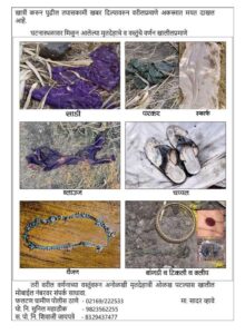 महिलेच्या अंगावर जांभळी साडी तिच्या पदराखाडील सोनेरी किनार हिरव्या पानांची फुले आहेत रंगाचा परकर, एक लेडीज चप्पल फिकट गुलाबी रंगाचा स्काप आधी साहित्य या मृतदेहाच्या अवयवा जवळ मिळाले असल्याने खळबळ उडाली आहे .