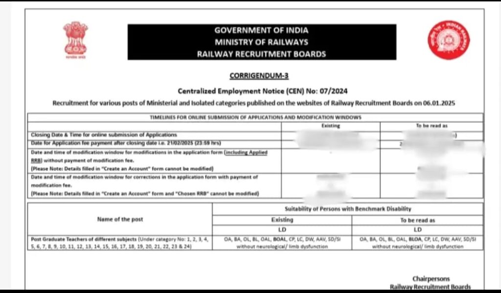 रेल्वे भरती मंडळांनी (RRBs) २०२५ मध्ये विविध RRB मंत्रीस्तरीय आणि वेगळ्या श्रेणीतील भरतीसाठी नोंदणीची अंतिम मुदत वाढवली आहे. उमेदवार आता २१ फेब्रुवारी २०२५ पर्यंत त्यांचे अर्ज सादर करू शकतात.