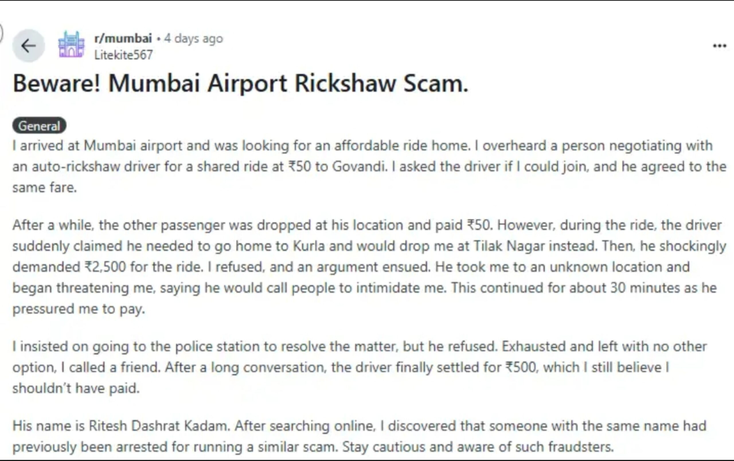 संबंधित प्रवाशाने रेडिटवर @Litekite567 या अकाउंटवरुन मुंबईतील रिक्षाचालकाच्या या स्कॅमबाबत एक सविस्तर पोस्ट टाकली आहे. त्यात त्याने सांगितलेय की, संबंधित रिक्षाचालकाचे नाव रितेश दशरथ कदम असे आहे, ज्याने ५० रुपयांत मुंबई एअरपोर्टवरून गोवंडीला सोडतो, असे सांगून प्रवाशाला अर्ध्या रस्त्यात उतरवले. नंतर तो प्रवाशाकडून जबरदस्तीने २,५०० रुपयांची मागणी करू लागला आणि पैसे देण्यास नकार देताच त्याने आपली माणसे गोळा करून मारहाणीची धमकी दिली. अखेर अर्धा तास वाद घालून, त्याने प्रवाशाकडून जबरदस्तीने ५०० रुपये वसूल केले.